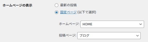 上記の場合、予め「HOME」と「ブログ」の固定ページを2つ作成しておく必要があります。